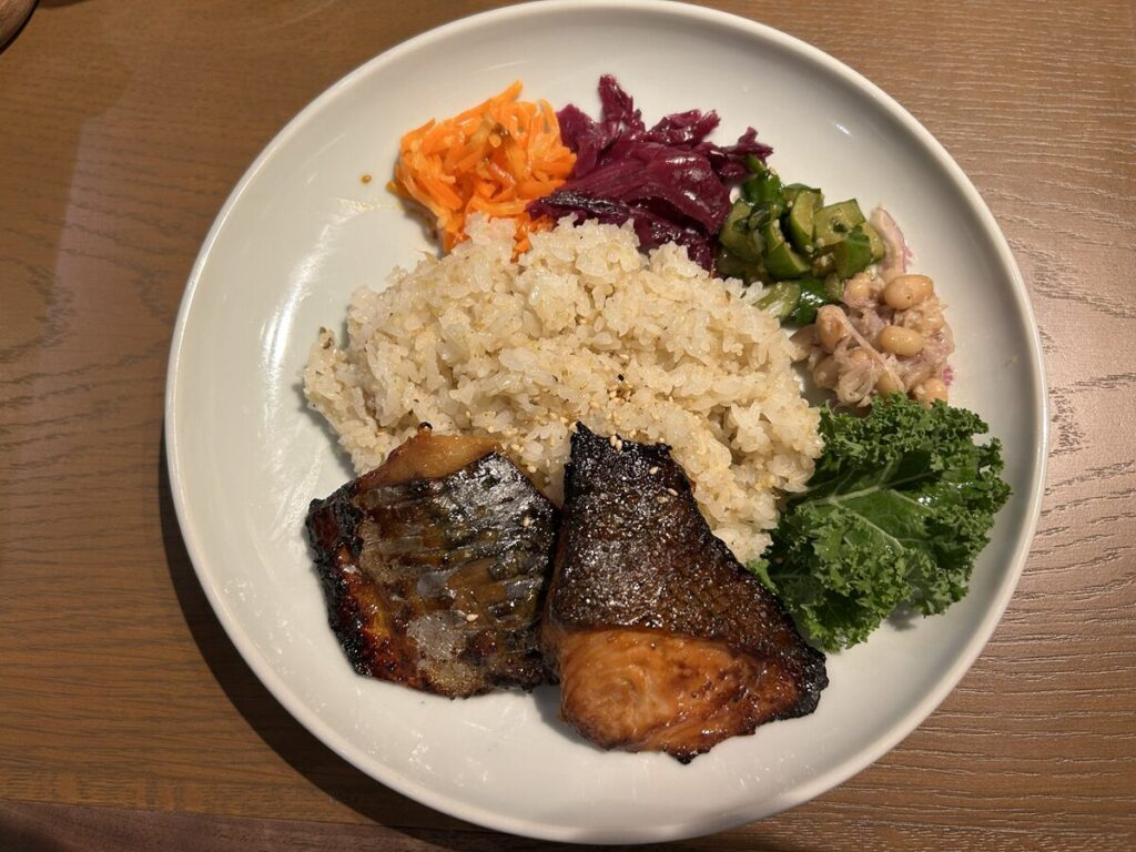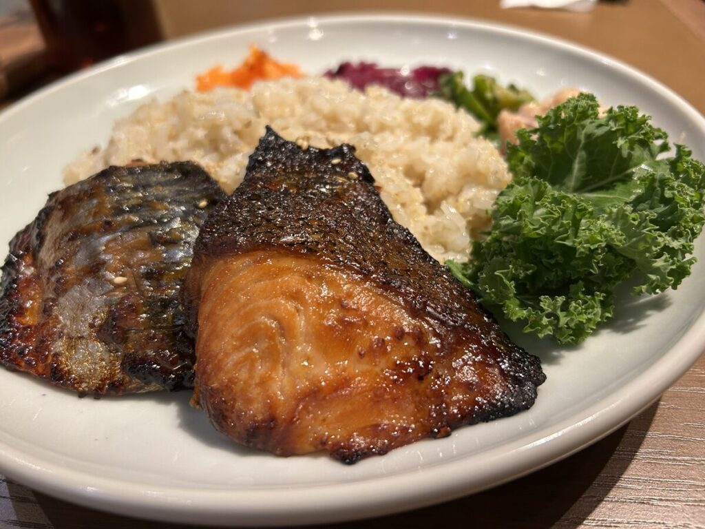 「やっぱり和食を食べたい」と思い、「サーモンと鯖のみそ漬け焼きプレート」を選びました。